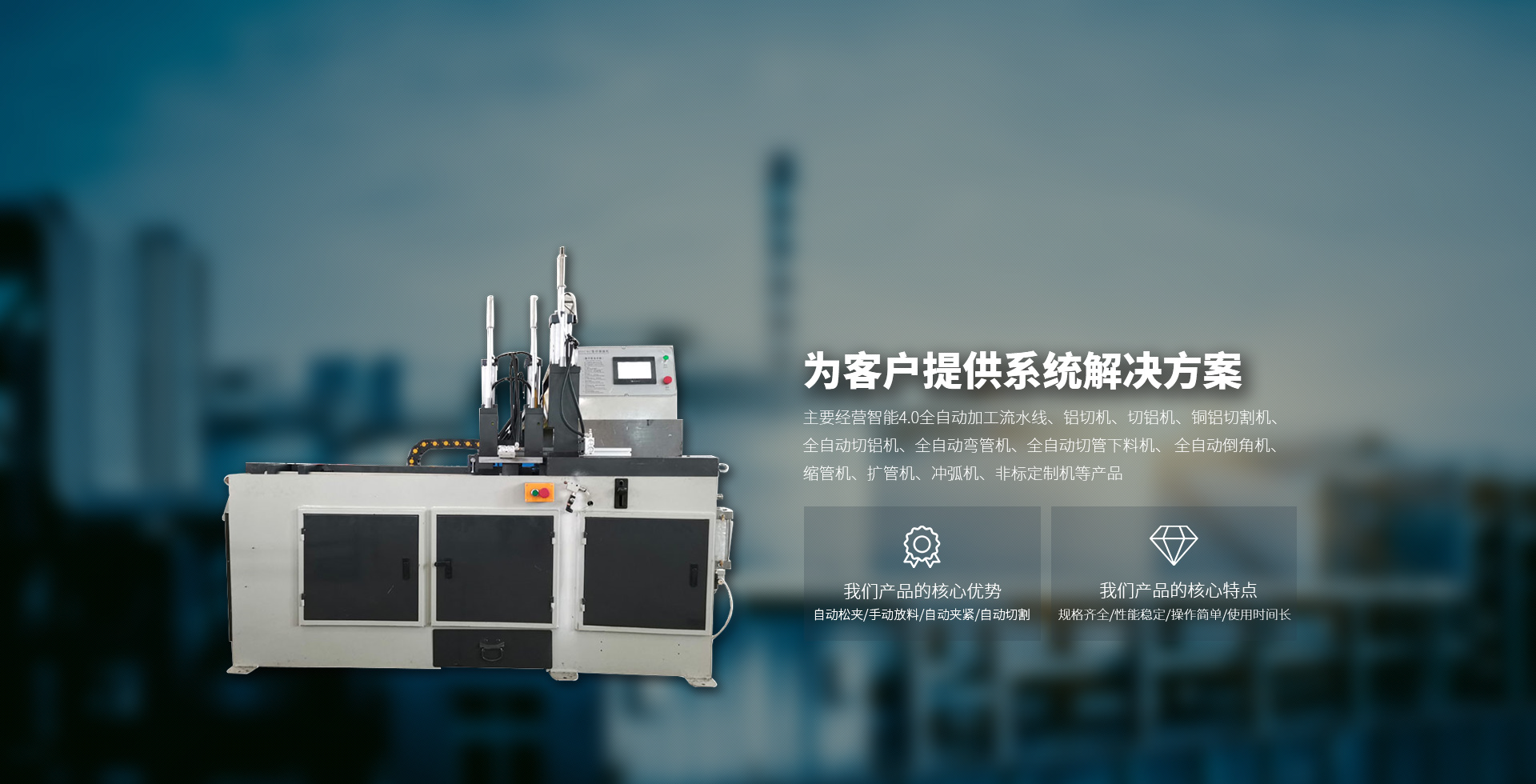 主要經(jīng)營智能4.0全自動加工流水線、鋁切機、切鋁機、銅鋁切割機、全自動切鋁機、全自動彎管機、全自動切管下料機、 全自動倒角機、縮管機、擴管機、沖弧機、非標定制機等產(chǎn)品